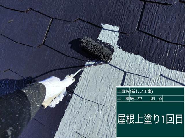 下塗りをたっぷり2回おこなったスレート屋根は、塗料の吸い込みが起こることなく、上塗り塗料がのっていきます。