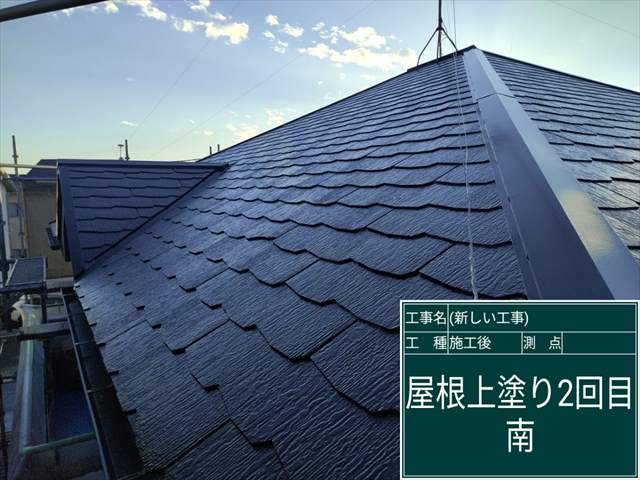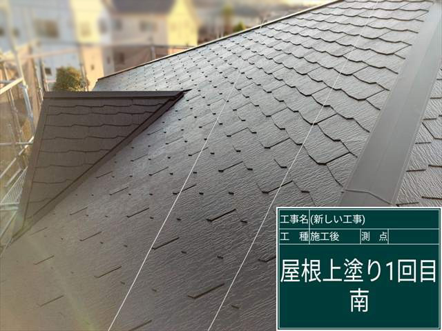 屋根塗装、上塗り塗装1回目が終わったところです。