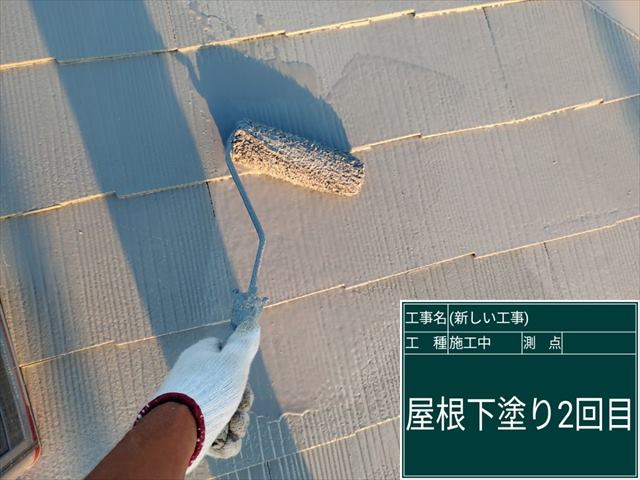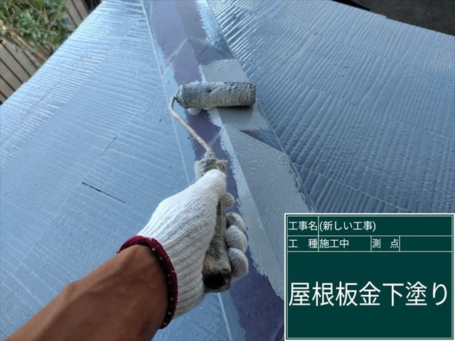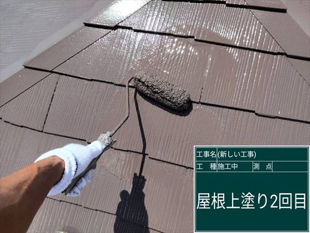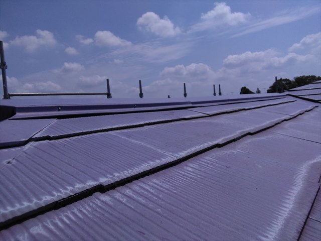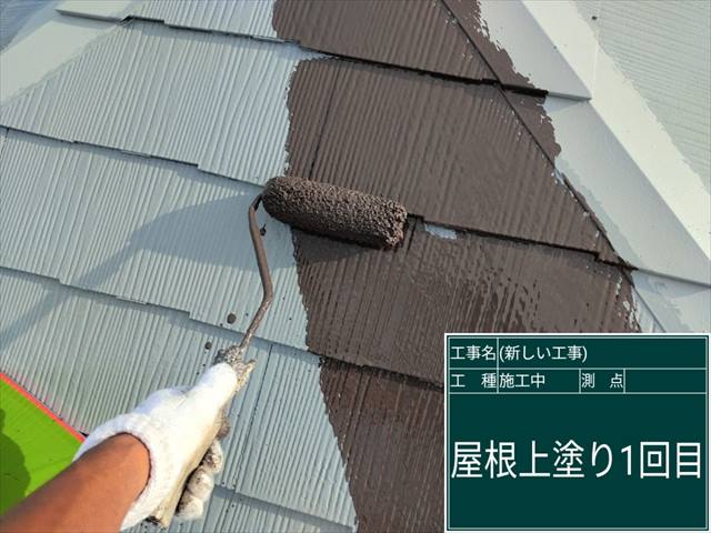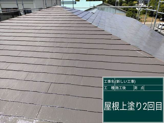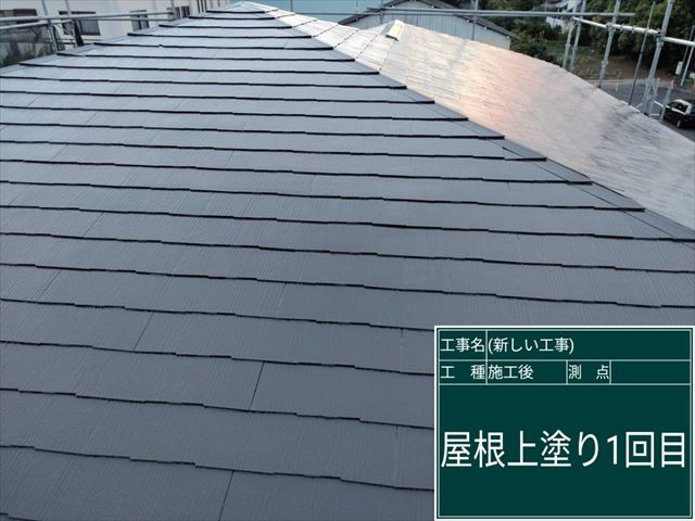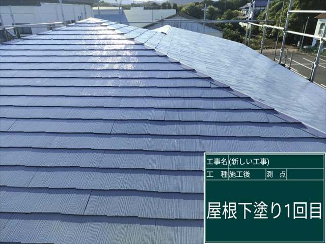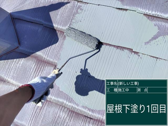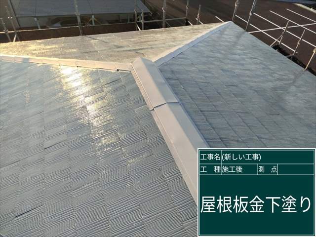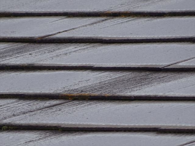傷んでいたスレート屋根には下塗りを2回、塗料の吸い込みがとまって下地が整った状態で上塗りをおこないます。