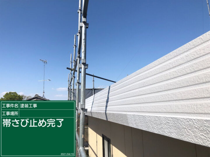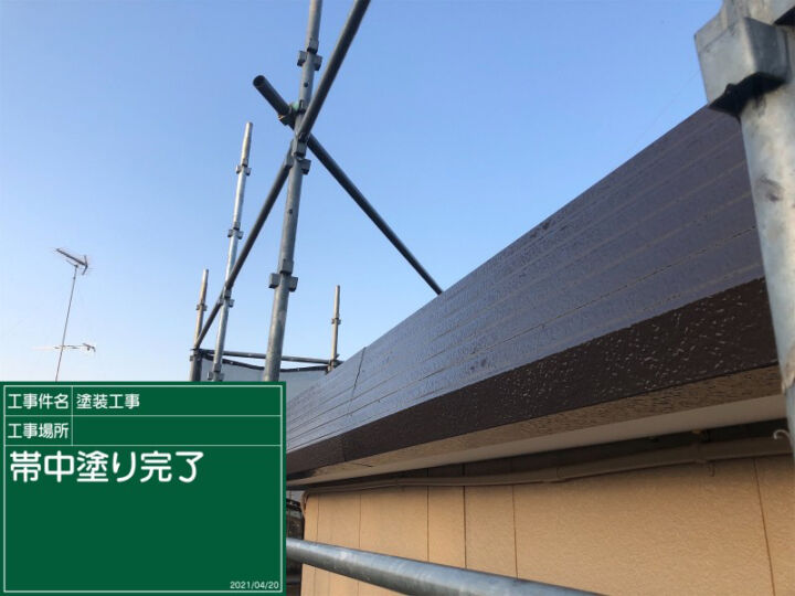 かすみがうら市の外壁塗装現場でおこなった帯板塗装、中塗りの様子です。