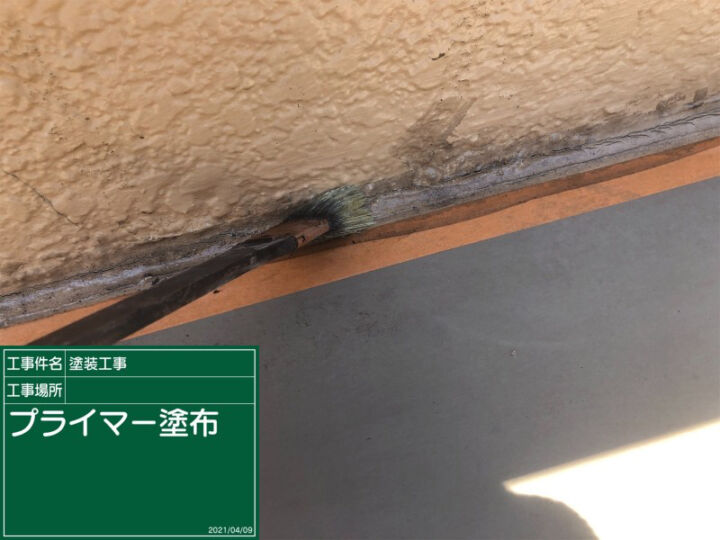 目地や別の部材との境に充填されているシーリング剤の上からプライマーを塗っていきます。