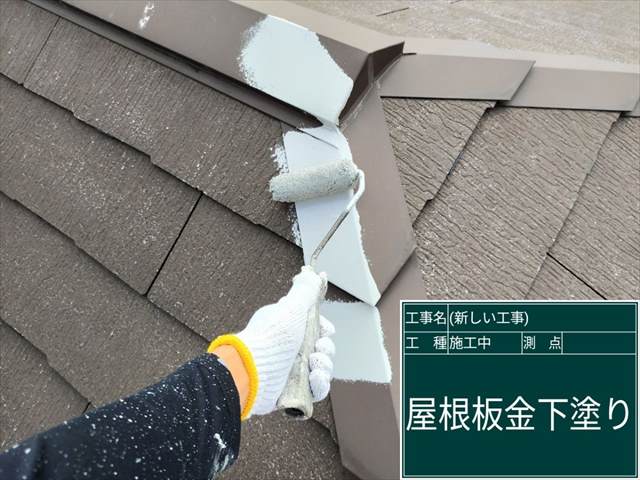 小美玉市の屋根塗装、タスペーサーで縁切りをおこなったら、板金部分の塗装をしていきます。