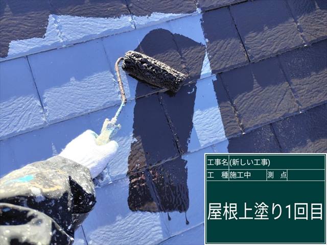 小美玉市の屋根塗装、上塗り1回目です。