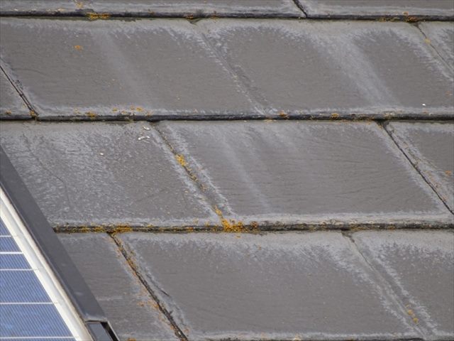 小美玉市の現地、築22年で前回の塗装から10年経過したスレート屋根の様子です。