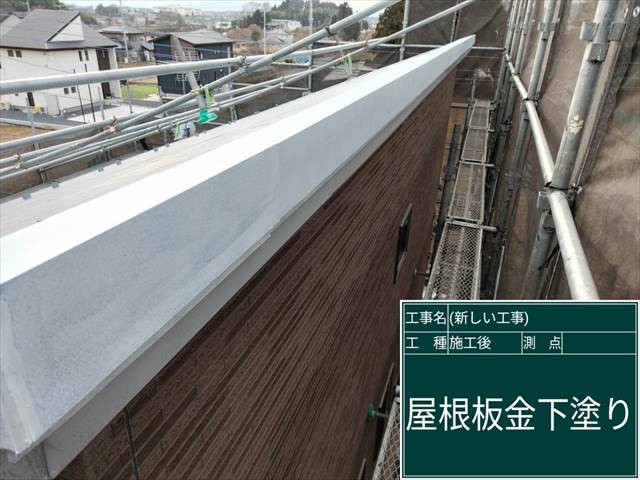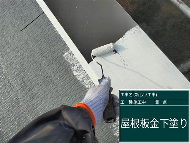 汚れで縞模様が出来ていた片流れのスレート屋根に、今回は棟板金塗装と下塗り3回目のご紹介です。
