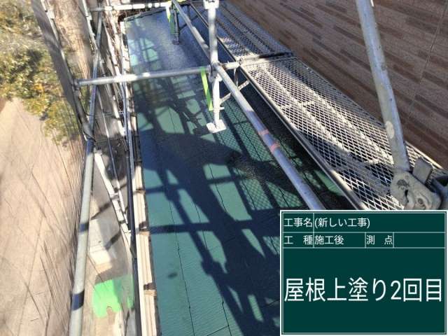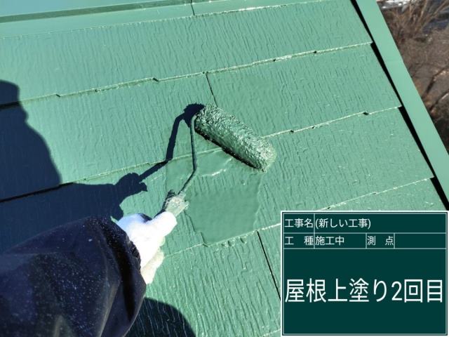 小美玉市でおこなった片流れスレート屋根の塗装、2回目の上塗り塗装です。