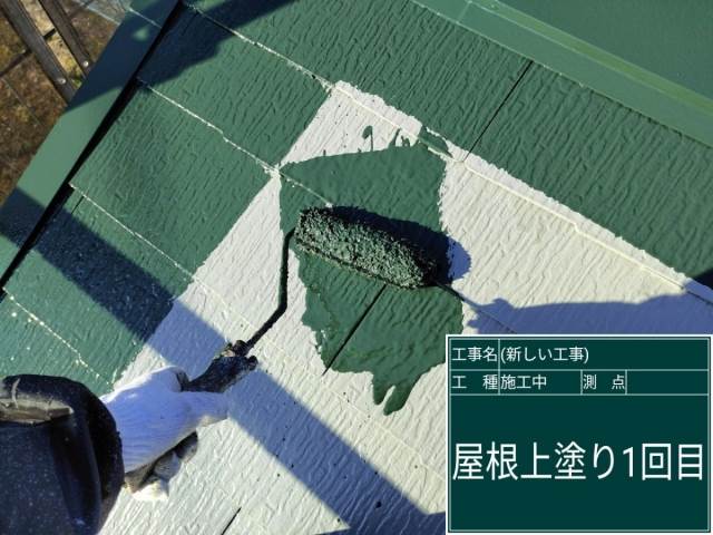 上塗り塗料は2回にわけて塗装をおこない、屋根を守る塗膜をつくっていきます。