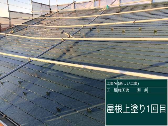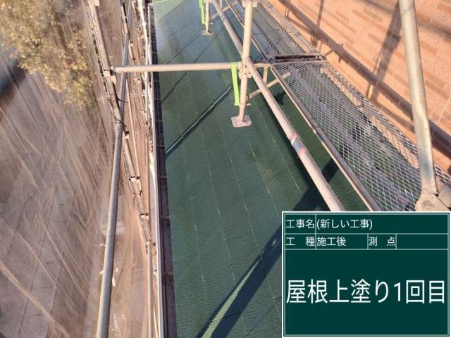 遮熱効果のある「スーパーシャネツサーモF」による上塗り塗装の1回目が完了しました。