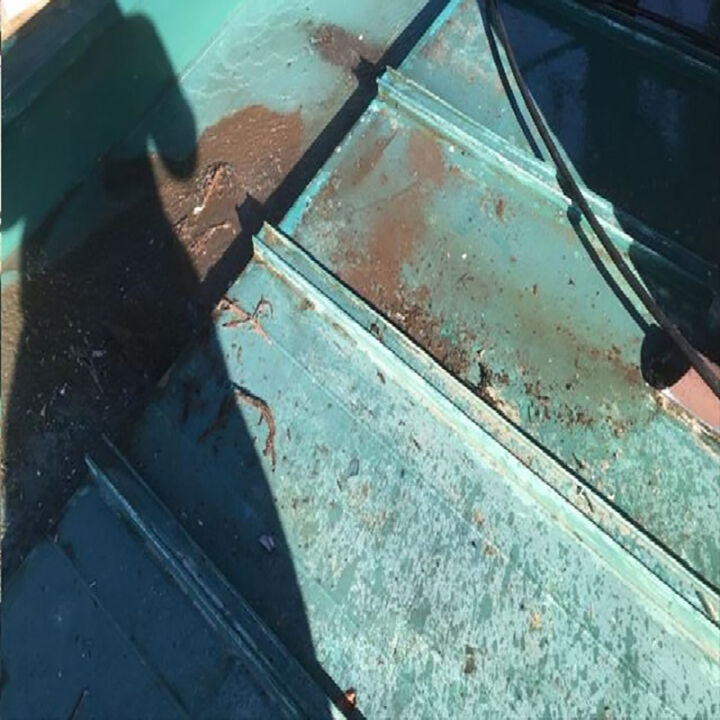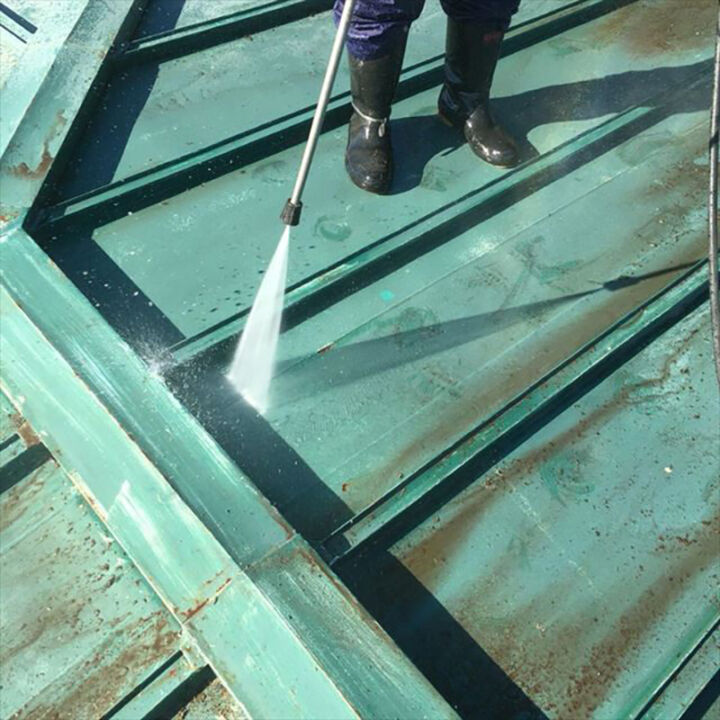 屋根に溜まってしまったゴミを150キロ圧の洗浄機で綺麗にしていきます。大きなゴミなどは手で除去していきます。