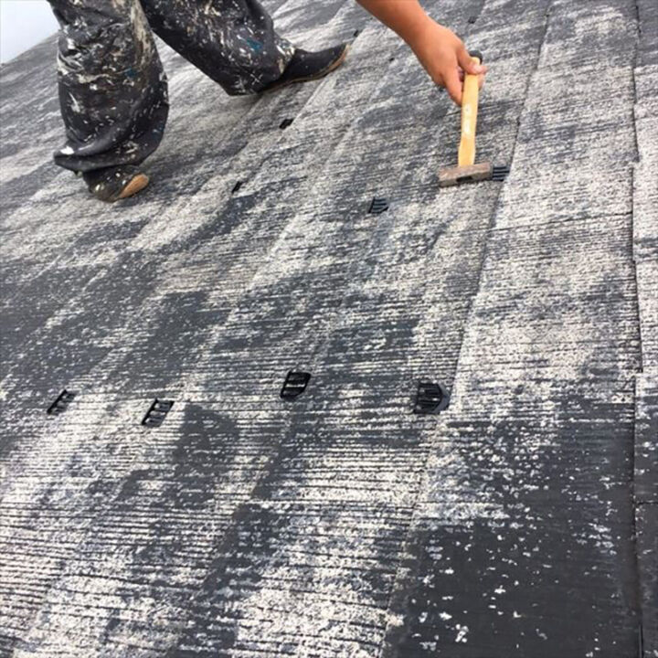 棟板金の釘浮きを修正し、しっかりと固定した後、屋根の通気性を確保するためにタスペーサーを設置しました。