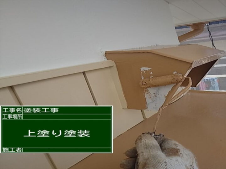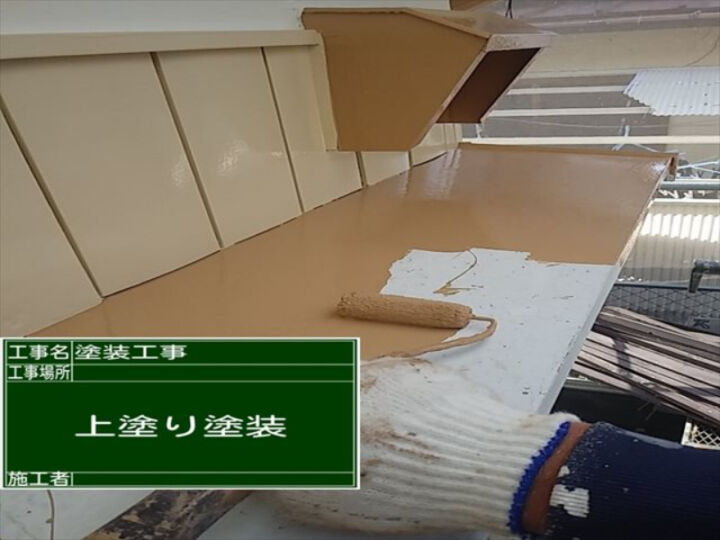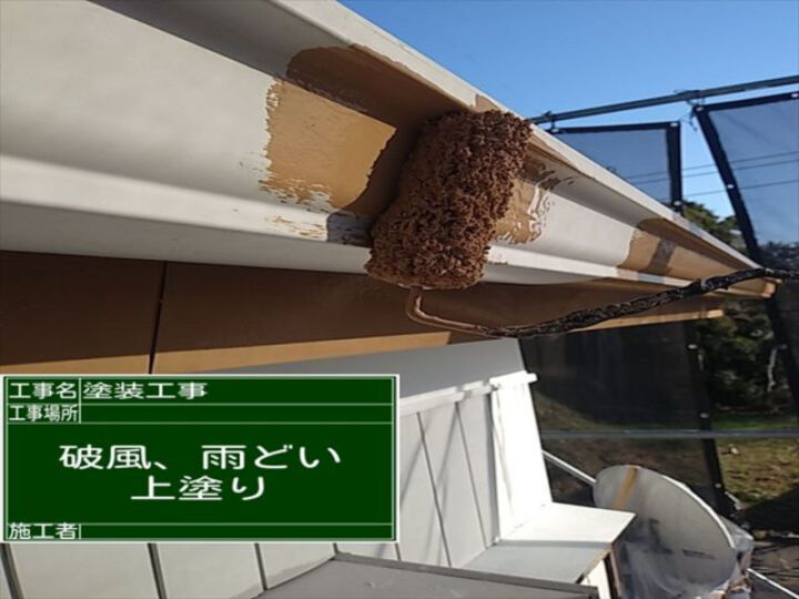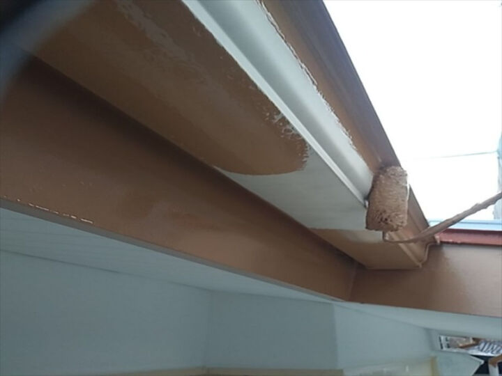 つくば市空き家再生現場、霧除け塗装の上塗りの様子です。