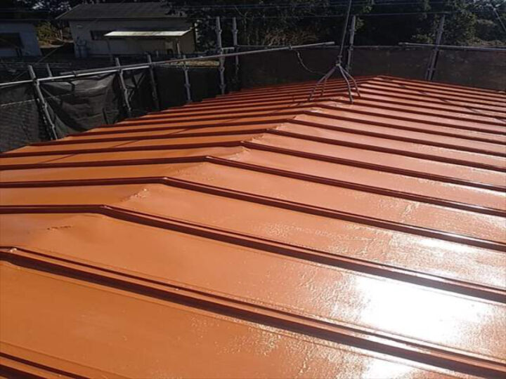 つくば市でおこなった築40年の板金屋根塗装、遮熱塗装上塗りをしていきます。