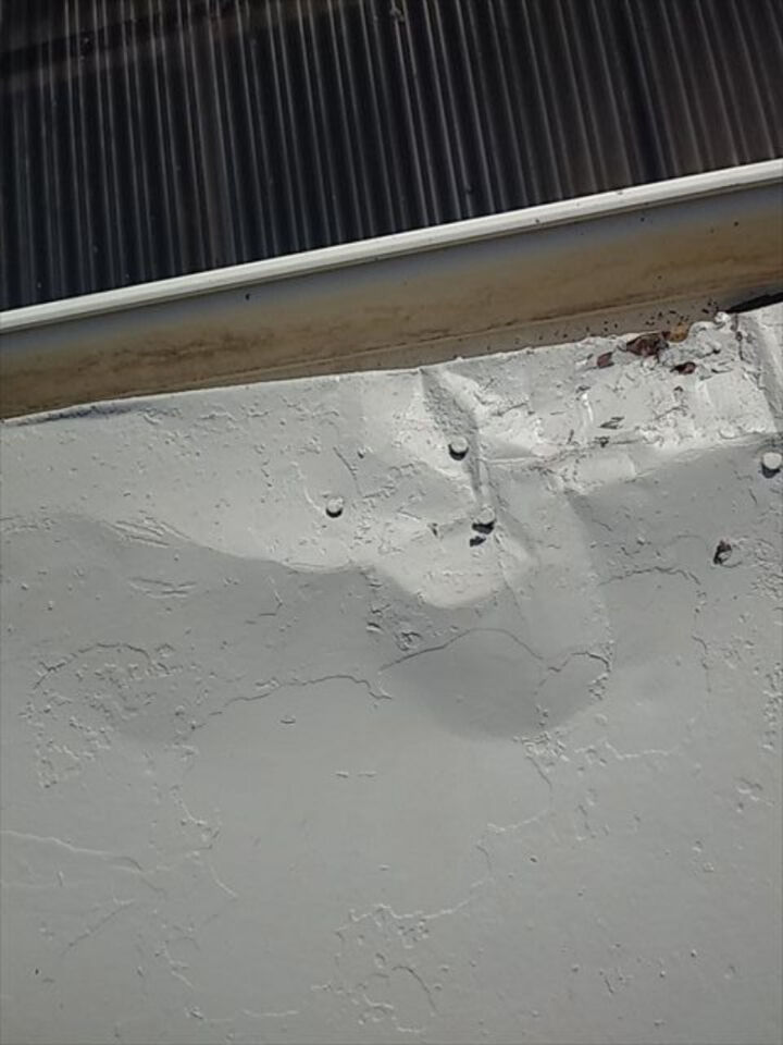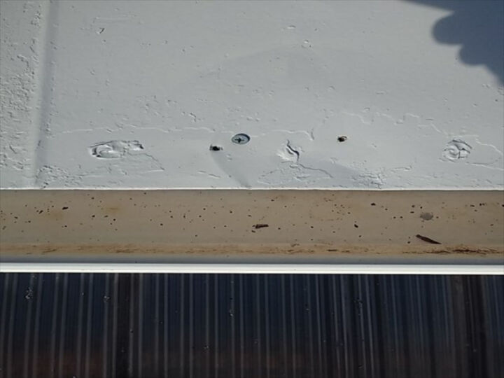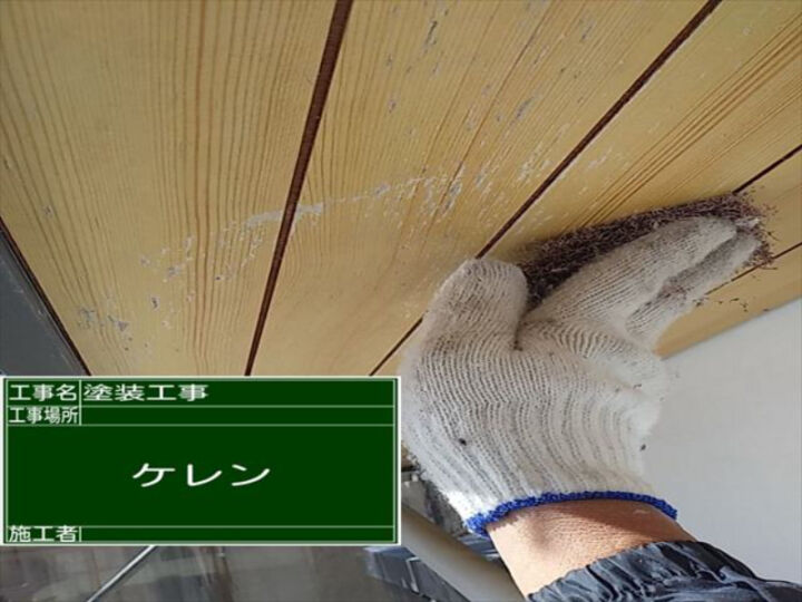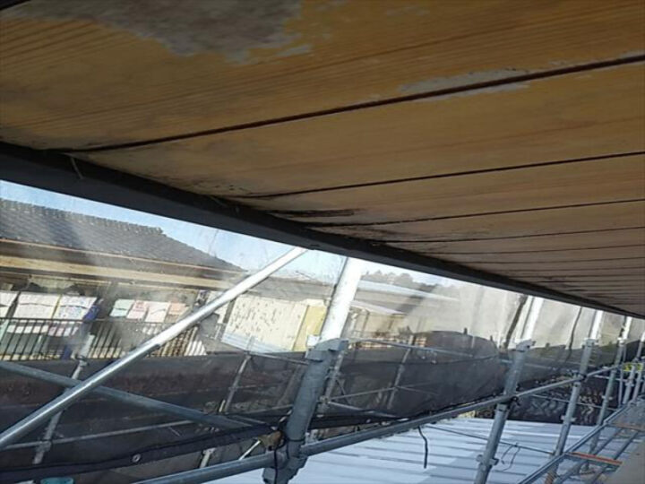 軒天材に痛みが見られますが、雨漏りではなく破風板から伝った雨水の影響で変色してもろくなっていました。