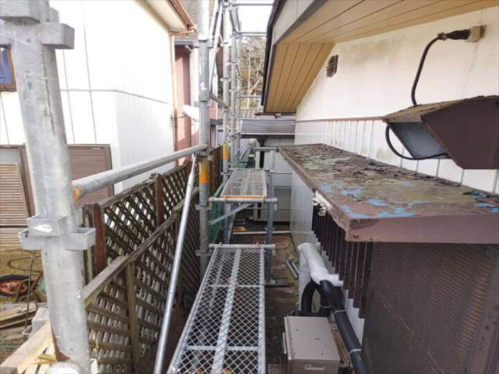 近隣住宅との間も狭く両方の建物に干渉しないよう最小限で組んでいます。