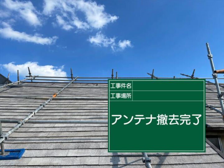 アンテナは棟板金を交換するときに撤去しました。左は高圧洗浄前の写真で、アンテナが付いた状態です。右は、高圧洗浄後でアンテナ撤去後の写真です。高圧洗浄でどれだけキレイになるのか一目瞭然ですね。
