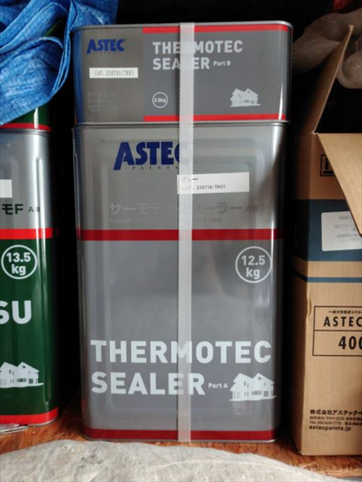 下塗りと上塗りの塗料が異なる理由をご存知でしょうか。下塗りには、素地と上塗り材の密着性を高める役割があり、上塗り材には密着性がない分、今回使用したスーパーシャネツサーモSiのように高機能を持たせることができます。2つの塗料を使い分けることにより、それぞれの塗料が持っている性能を発揮させることが出来上がります。その他にも、塗料を規定の時間塗料を撹拌させたり、使用期限を守ること、面積に対して使用する量も決められています。それら全てを守ることで丈夫で美しい塗膜に仕上げることができます。