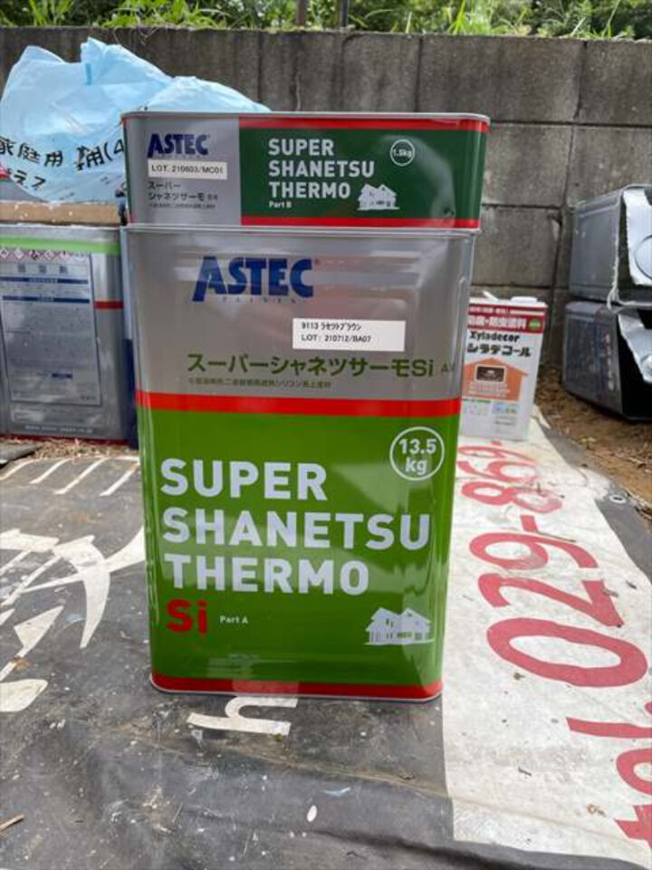 中塗り(1回目の上塗り)と上塗りには、スーパーシャネツサーモSiを使用します。この塗料は特殊無機塗料を使用しているので、遮熱性が高く、夏場の光熱費を抑えることができます。また、耐候性が高く色あせし難いので、美しい状態を長く保つことができます。