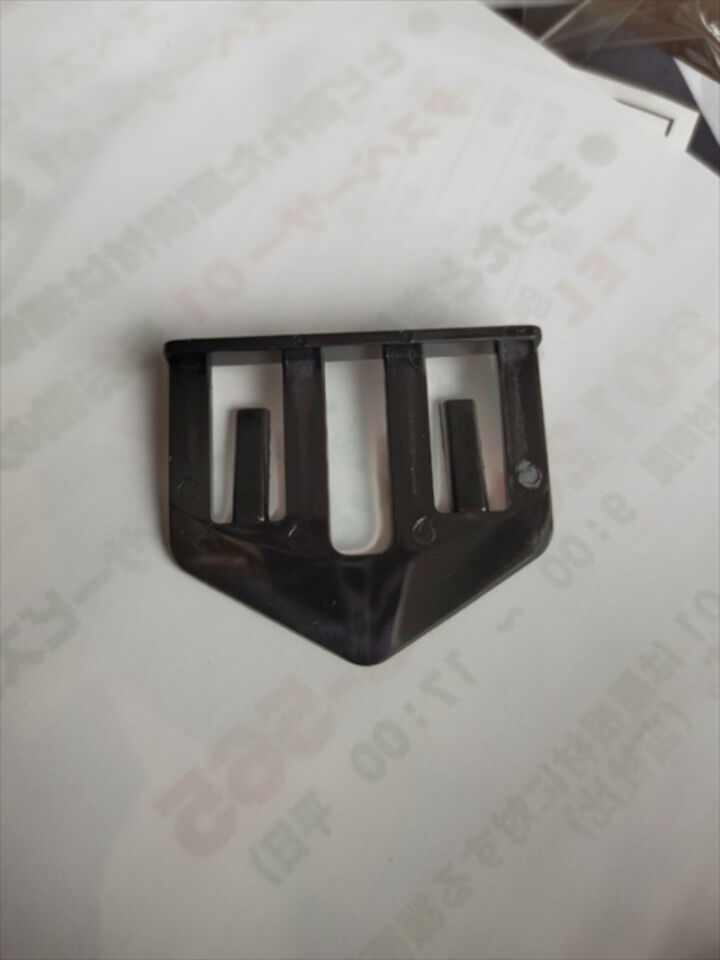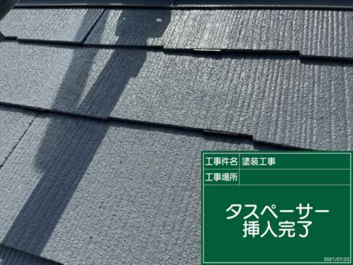 左の写真の部品がタスペーサーです。スレート材同士の隙間が塗料の膜である、塗膜によって覆われてしまうのを防ぐ役割があります。スレート材1枚につき2つのタスペーサーを挿入します。以前はつながった塗膜を切るために縁切りと呼ばれるカッターの刃を差し込み隙間を作っていました。手間がかかっていまう上に、カッターでキズを付けてしまうことがありました。この縁切りをおこなう代わりに、タスペーサーを挿入することで充分な隙間を確保することができるようになりました。