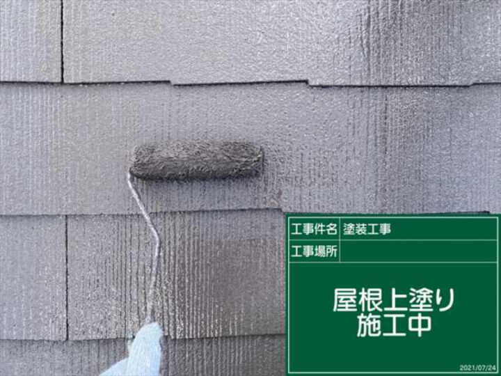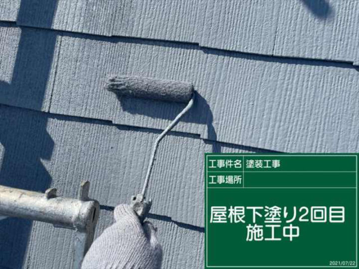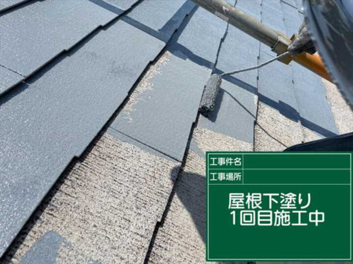 屋根の下塗りに使用するのはサーモッテックシーラーを使用します。密着性・耐久性が高く、赤外線を反射するという遮熱機能を兼ね備えています。右側の写真は、スレート材1枚づつ丁寧にローラーで塗布しているようすです。