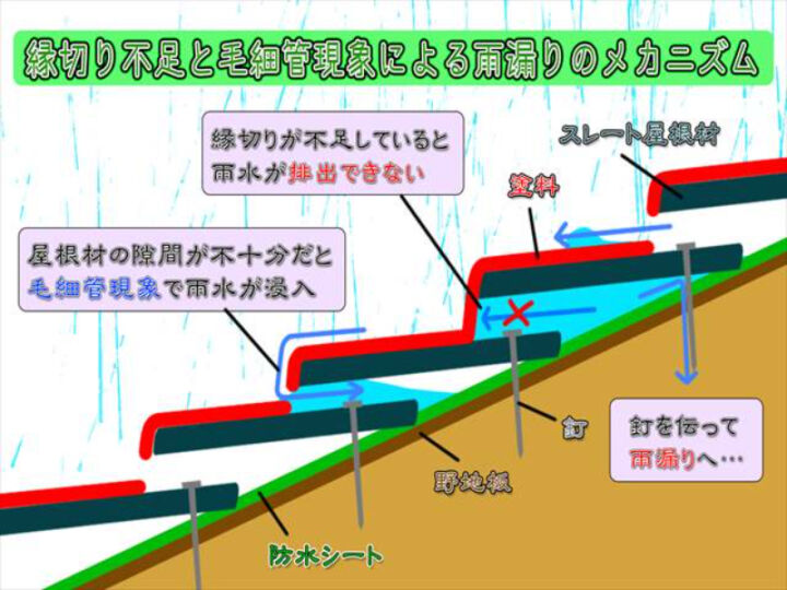 左の図は、屋根の断面を表したものです。赤が塗膜を表しています。きちんと隙間がある個所は雨水が流れ落ちていますが、隙間がない部分や充分に縁切りがされていない部分は屋根の内部に雨水が入り込んでしまっています。内部に侵入した雨水は釘を伝い野地板に染み込み、ひどくなると野地板が腐ってしまいます。