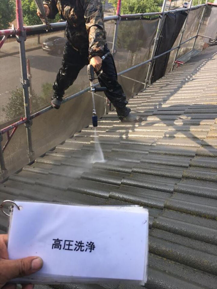 塗装前に長年にわたり溜まった汚れやコケなどを高圧洗浄機と言う機械を使い綺麗に水洗いしていきます。