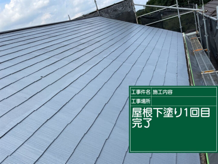 土浦市の雨漏り現場、車庫の屋根塗装1回目の下塗りが完了しました。
