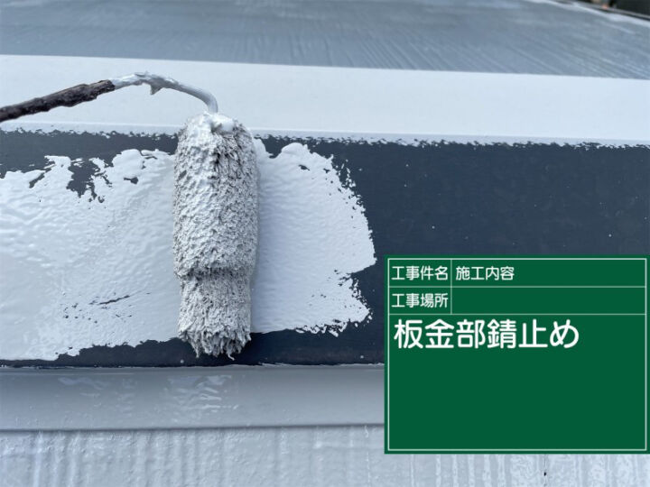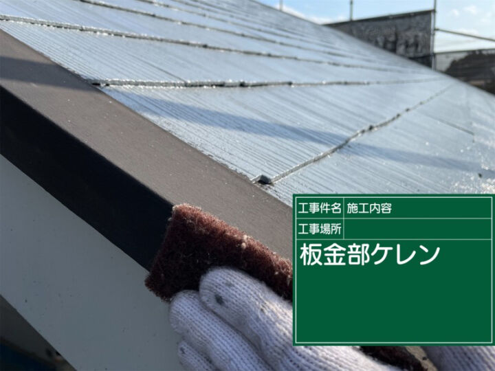 屋根の雨押えや棟などは金属部材のため、まずはケレン処理をしてサビを落とし、塗料との密着性を上げていきます。