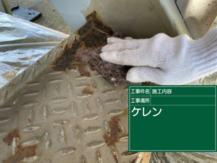 金属製の階段のため、まず、サビをケレン処理で落としていきます。
