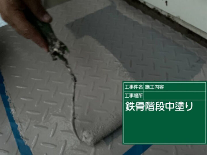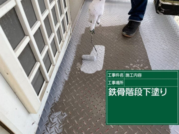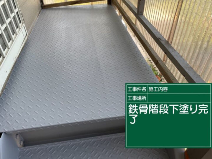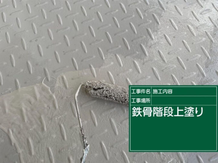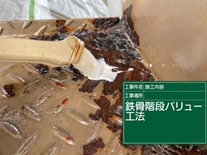 金属製部材は酸素に弱く、酸化という劣化がはじまるとサビを発生させるので、しっかりサビ止めを塗っていきます。防サビ塗装を行うことで、サビの発生を防いできれいな階段を維持します。