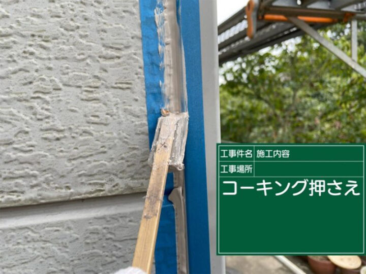 打ち込んだコーキングをヘラで圧着します。