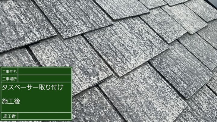 スレート屋根の縁切り作業、タスペーサー取付が終わりました。 屋根材の間に隙間がないと、大雨などの際に屋根材の下に入り込んだ雨水の逃げ道がなくなってしまい、雨漏りの原因になってしまいます。 隙間がないと屋根の腐食を進行させることにもなりかねません。 タスペーサーの取り付けは、雨漏り防止や内部結露を防いでくれます。