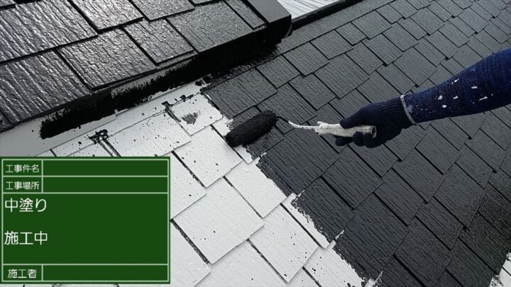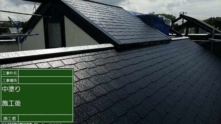 ローラーやハケを用いながら、丁寧に塗布していきます。 屋根塗装の中塗りが完了しました。