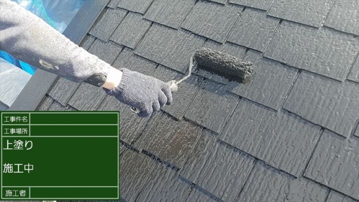 土浦市ミサワホーム施工の家のスレート屋根塗装、上塗りの様子です。 決まった時間しっかり乾燥させ、もう一度同じ塗料を塗っていきます。 塗料の厚みをつくり、性能をしっかり出せる状態にしていきます。 塗りムラや塗り残しが無いように、丁寧に施工していきます。