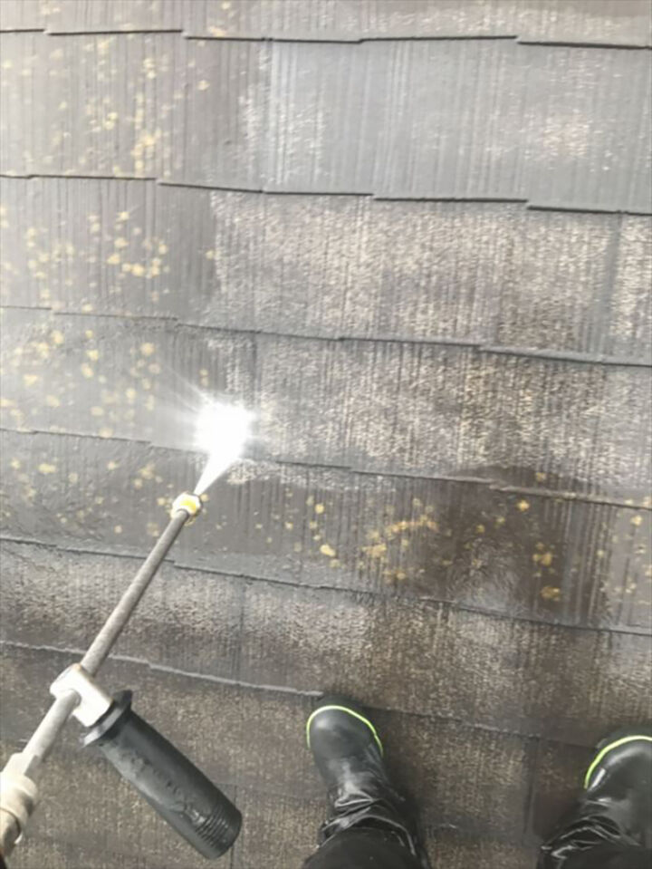 塗装前に屋根、壁と高圧洗浄機で洗い流していきます。汚れやコケが残っていますと塗料が剥がれてしまったりと異常が起こりますので綺麗に洗い流していきます。